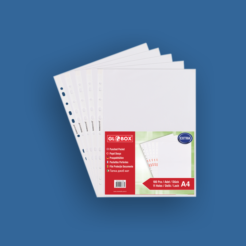 Deschidere superioara ce permite accesul la documente fara a scoate folia din biblioraft/caiet mecanic. 11 perforatii pentru arhivare in biblioraft si caiet mecanic. Pentru format A4.