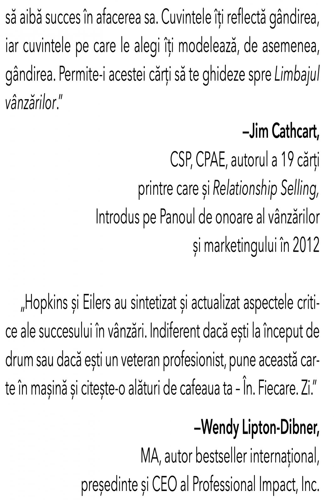 „Hopkins si Eilers au sintetizat si imbunatatit cele mai critice subiecte pentru a avea succes in vanzari. ...pune cartea asta in masina si citeste-o alaturi de cafeaua ta. In. Fiecare. Zi.”– Wendy Lipton-Dibner, MA, autor bestseller international, presedinte si CEO la Professional Impact, Inc.