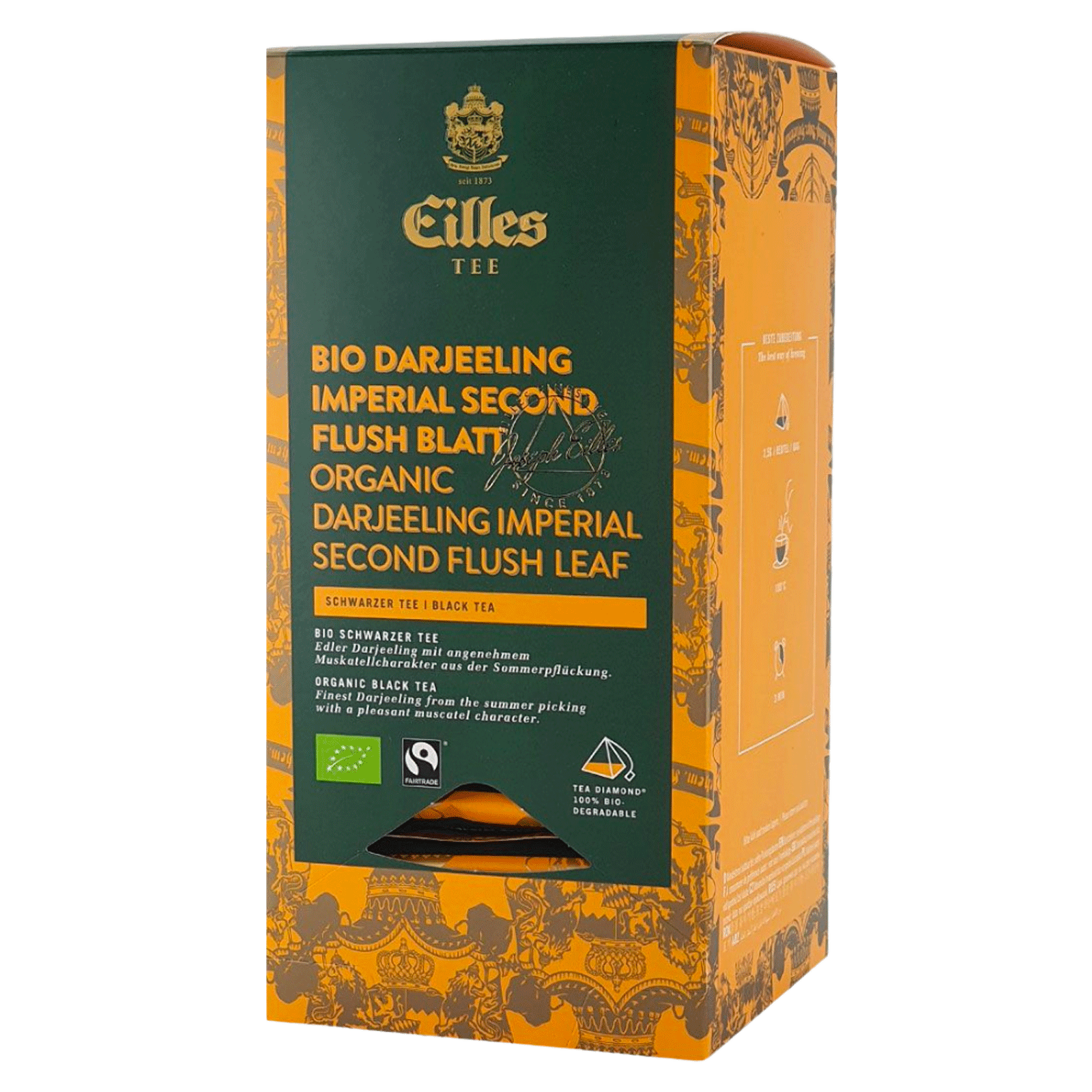 Notă mată, delicată de nuci și culoare aurie. Calitate organică certificată. EILLES World Luxury Selection impresionează prin cutia sa elegantă de dozare ce contine 20 de porții individuale (50 g în total).