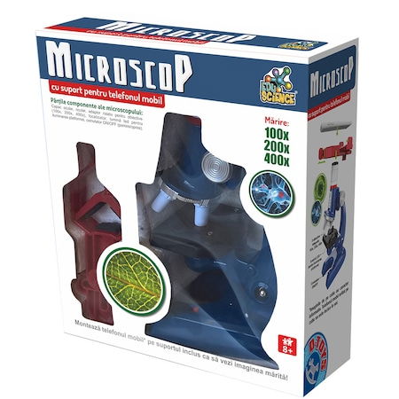Monteaza telefonul tau mobil pe acest microscop special ca sa vezi si mai multe detalii! Miscroscopul este dotat cu 3 oculare cu marire de 100x, 200x si 400x, focalizator, lumina led pentru iluminarea platformei, comutator ON/OFF.