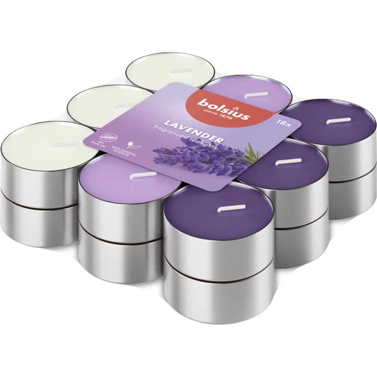 Lumanarile parfumate tip pastila Bolsius vor asigura o atmosfera placuta si primitoare in locuinta. Setul contine 18 lumanari cu design clasic in paharele de aluminiu, cu parafina de culoare mov si parfum placut cu aroma de lavanda.