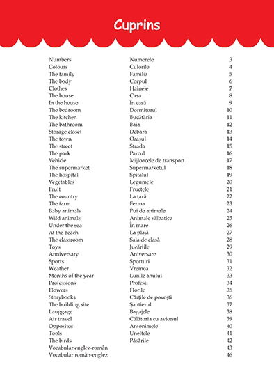 Structurata in 40 de teme (denumiri de meserii, de obiecte, de animale etc) prezentate copiilor intr-o forma grafica atractiva, invatarea limbii engleze devine o distractie.