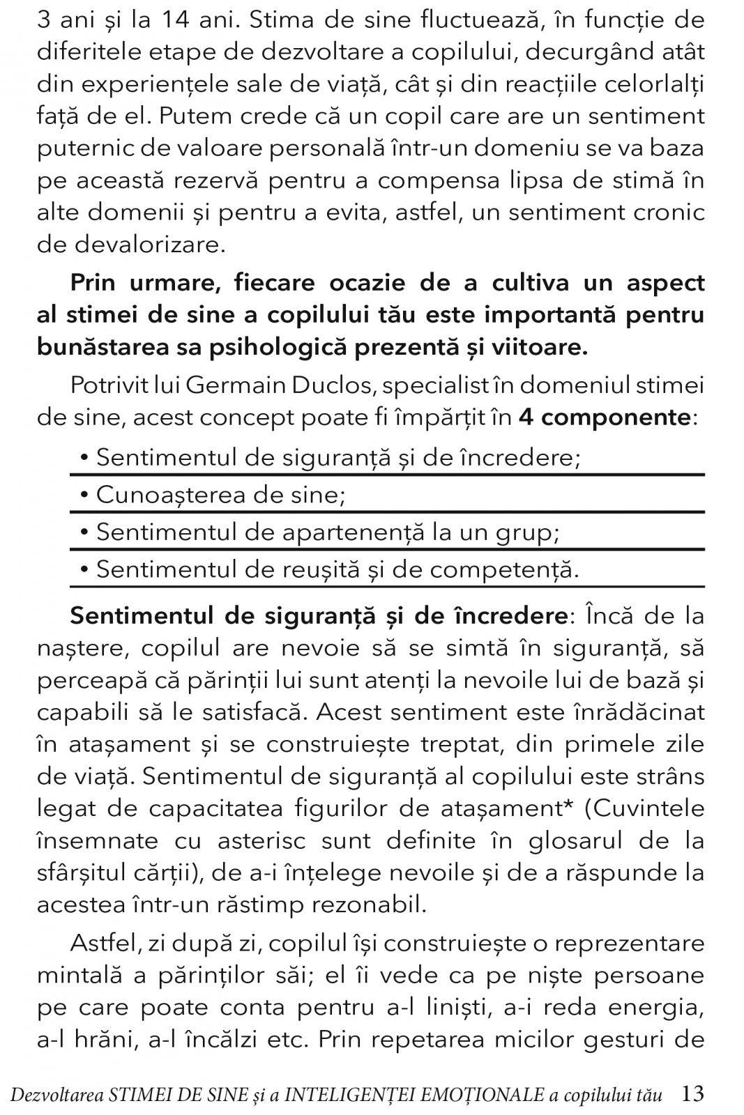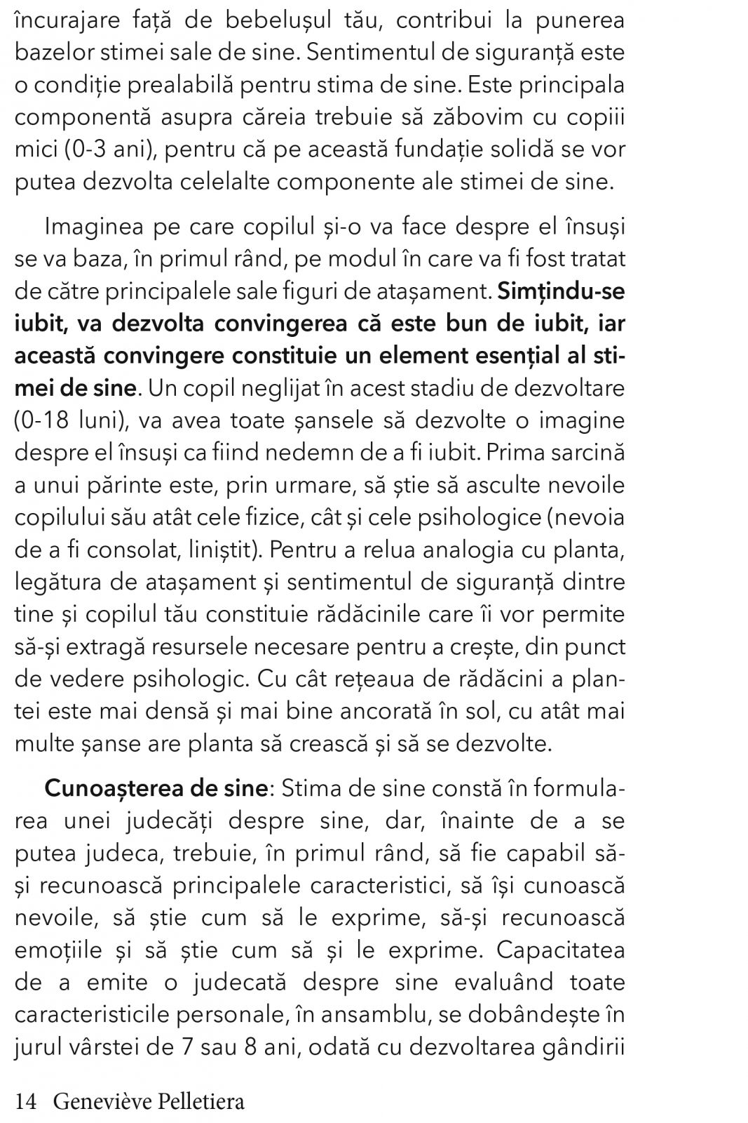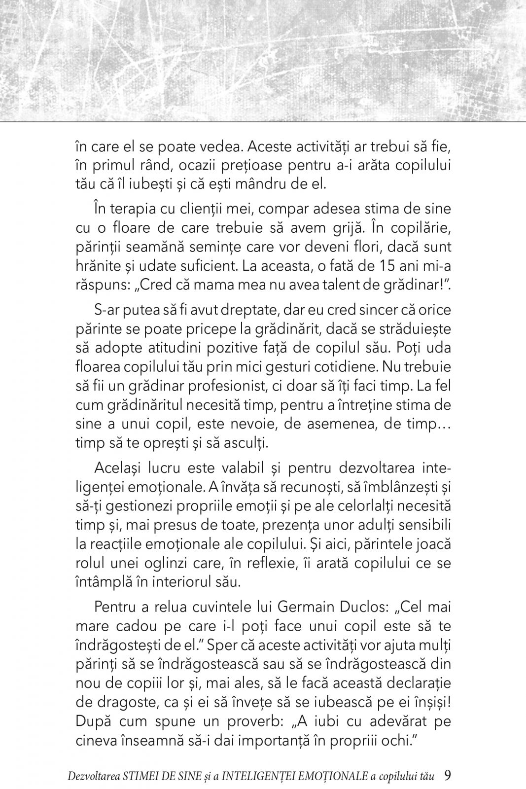 Cartea de fata prezinta definitiile conceptelor de stima de sine si de inteligenta emotionala si explica importanta acestor notiuni pentru dezvoltarea si sanatatea psihologica a copiilor. In egala masura, cartea abordeaza importanta jocului si da sfaturi despre cum poate fi utilizat jocul pentru a favoriza dezvoltarea psihologica a copilului. Este ilustrata cu exemple extrase din practica clinica a autoarei.