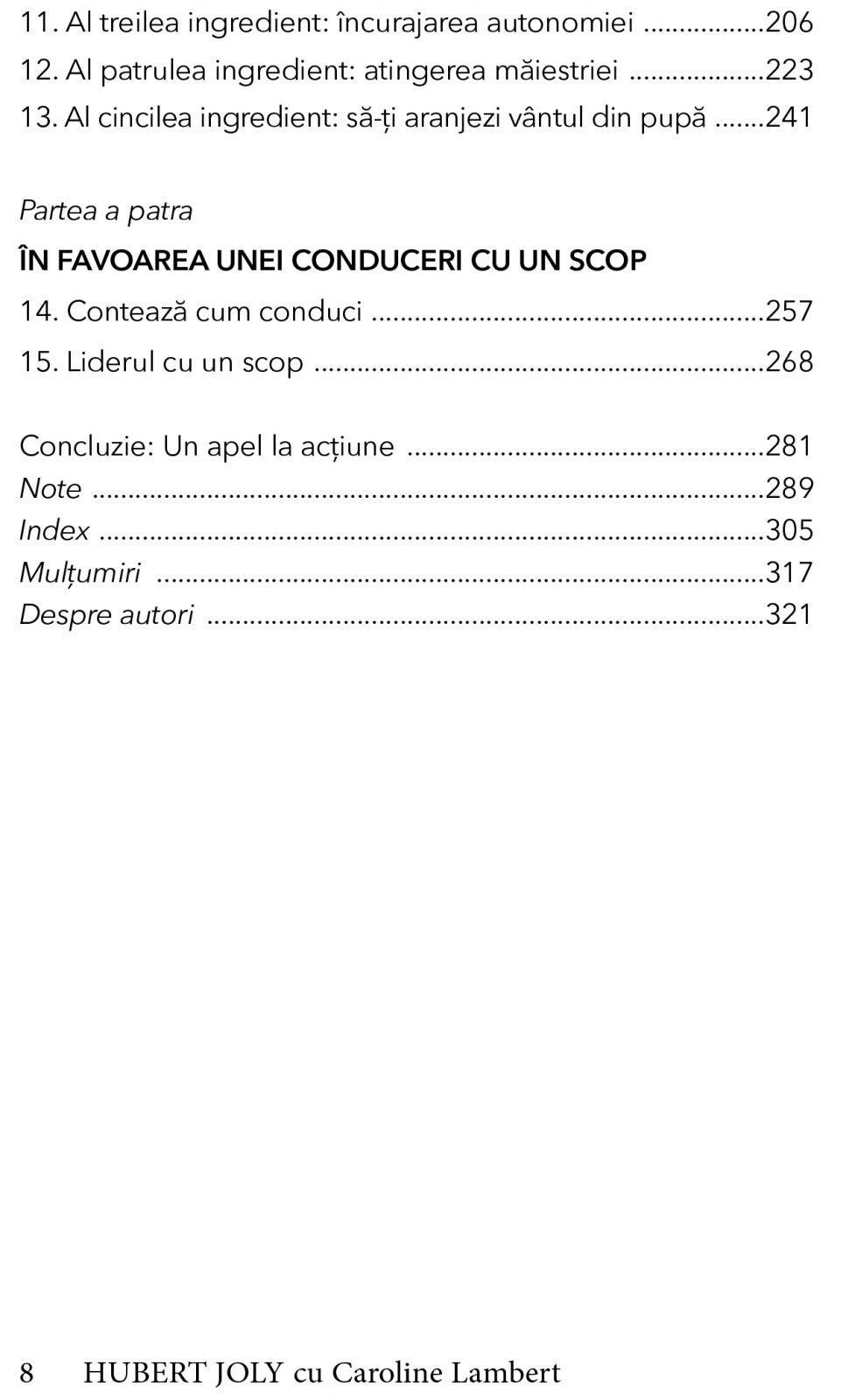 Aceasta abordare este usor de inteles, dar punerea ei in practica nu este la fel de usoara. Ea necesita regandirea radicala a modului in care privim munca, in care definim companiile, motivam oamenii si con ducem. In aceasta carte, Joly ne impartaseste povesti memorabile, lectii si sfaturi practice, toate extrase din experienta transformarii sale de la un consultant McKinsey foarte determinat la un lider care crede in magia umana.