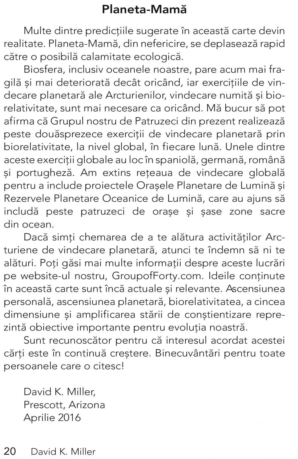 David K. Miller poseda o experien­ta extinsa in domeniul psihologiei  si psihoterapiei. Dupa treizeci si cinci de ani de pratica conventio­nala, David se concentreaza, in prezent, in mod exclusiv asupra psi­ho­logiei sufletului. El primeste informatii si mesaje directe din partea Arcturienilor de peste douazeci si doi de ani. Ca rezultat al acestei conexiuni puternice, el a canalizat peste 15 carti, a scris peste 200 de articole si a condus peste 50 de ateliere internationale pe tema Arcturienilor. David este, de asemenea, fondatorul grupului international pentru meditatie cunoscut ca Grupul de Patruzeci.