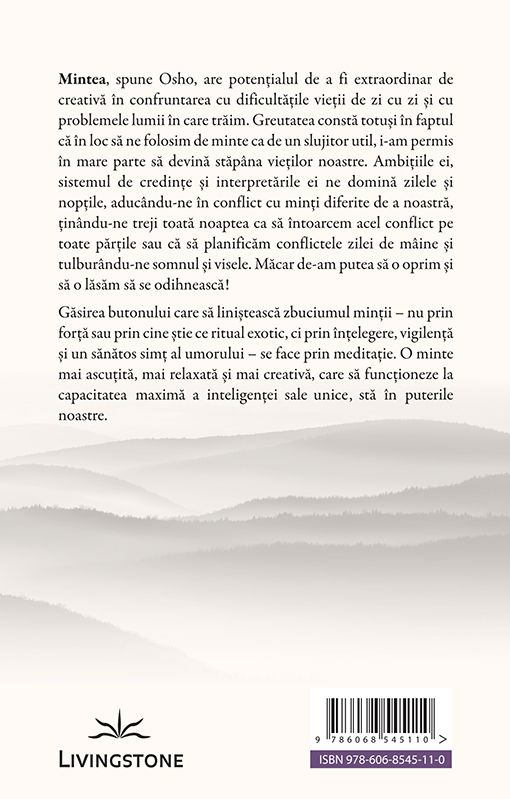 Mintea, spune Osho, are potentialul de a fi extraordinar de creativa in confruntarea cu dificultatile vietii de zi cu zi si cu problemele lumii in care traim. Greutatea consta, totusi, in faptul ca in loc sa ne folosim de minte ca de un slujitor util, i-am permis in mare parte sa devina stapana vietilor noastre. Ambitiile ei, sistemul de credinte si interpretarile ei ne domina zilele si noptile – aducandu-ne in conflict cu minti diferite de a noastra, tinandu-ne treji toata noaptea ca sa intoarcem acel conflict pe toate partile sau ca sa planificam conflictele zilei de maine si tulburandu-ne somnul si visele. Macar de-am putea sa o oprim si sa o lasam sa se odihneasca!