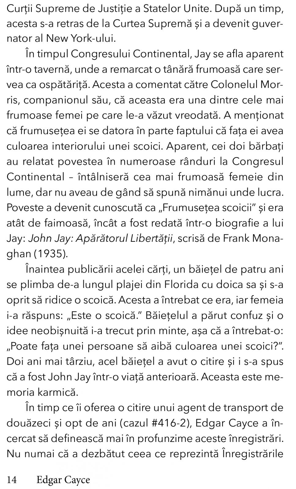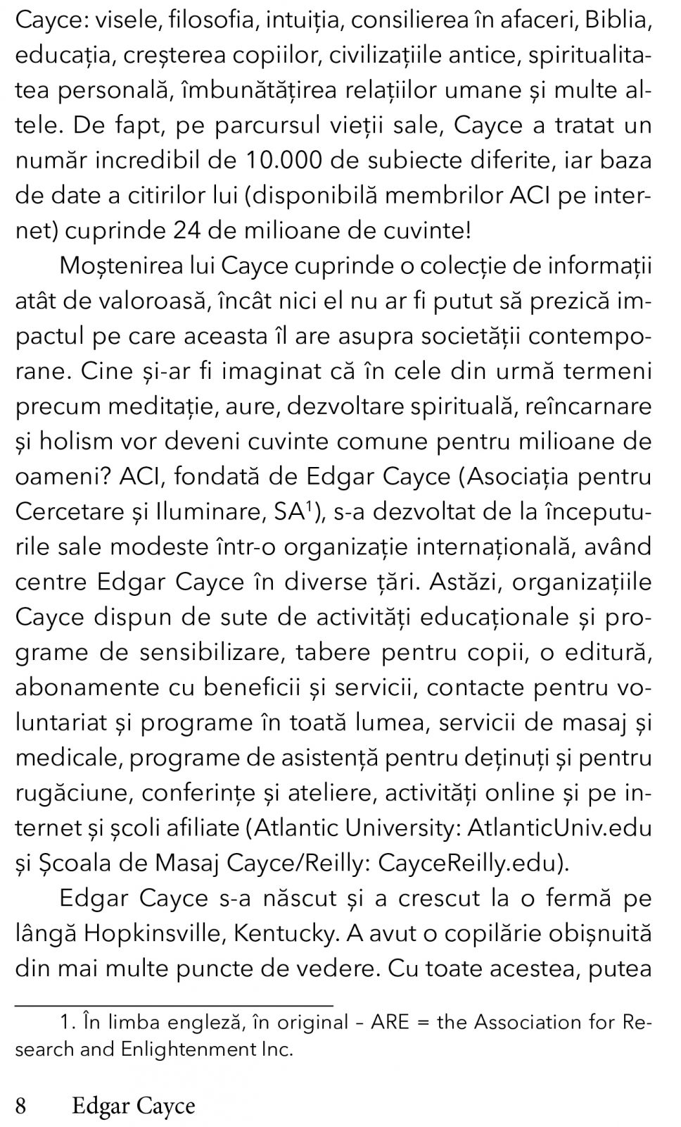 Edgar Cayce (1877-1945) s-a nascut la o ferma de langa Hopkinsville, Kentukcy. In general, a fost un individ mediocru. Totusi, de-a lungul vietii sale, a manifestat unul dintre cele mai remar­cabile talente mediumnice din toate timpurile. De tanar, el a remarcat ca era capabil sa intre in stari de transa autoindusa, care ii dadeau posibilitatea sa se conecteze la o sursa nelimitata de informatie. In timp ce era in transa, putea sa raspunda la intrebari sau sa dea discursuri amanuntite pe orice tema. Aceste discursuri, mai mult de 14.000 la numar, au fost transcrise in timp ce el vorbea si sunt denumite „citiri”.