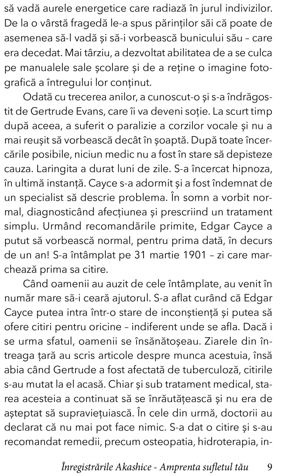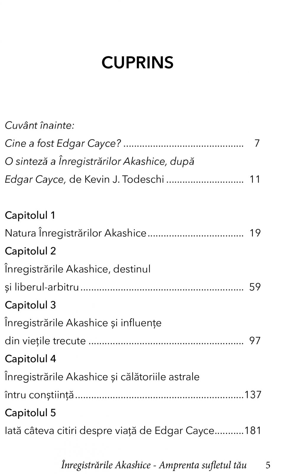 Inregistrarile Akashice, sau Cartea vietii, pot fi comparate cu un super-computer al Universului care functioneaza ca un depozitar central ce detine informatiile tuturor indivizilor care au trait vreodata pe Pamant. Mai mult decat o simpla colectie de experiente, Inregistrarile Akashice cuprind fiecare fapta, cuvant, simtamant, gand si intentie care s-au manifestat vreodata de-a lungul istoriei lumii. Si, in loc sa fie statice, inregistrarile sunt interactive, avand o influenta formidabila asupra vietii noastre de zi cu zi, asupra relatiilor, sentimentelor si sistemelor noastre de credinta, precum si asupra realitatilor potentiale pe care le atragem catre noi. Citirile lui Edgar Cayce din Inregistrarile Akashice reprezinta o resursa bogata pentru a intelege cum sa te conectezi si sa folosesti cunostintele propriilor tale inregistrari pentru a-ti imbunatati viata.
