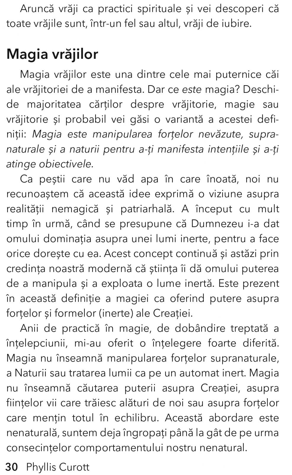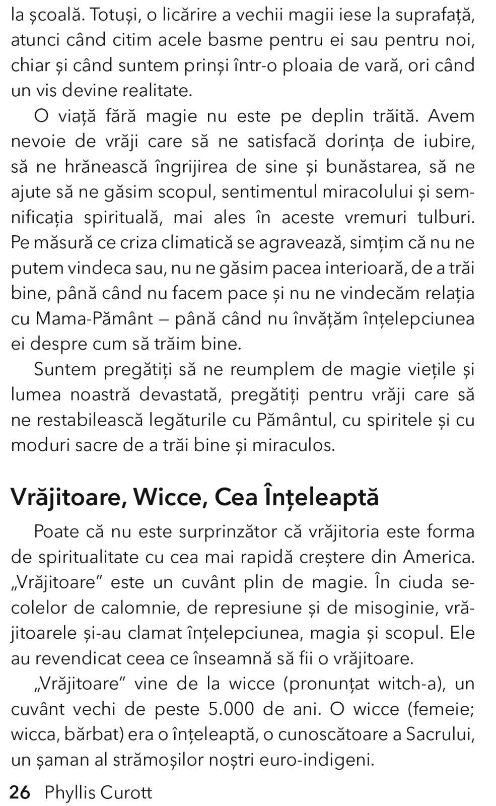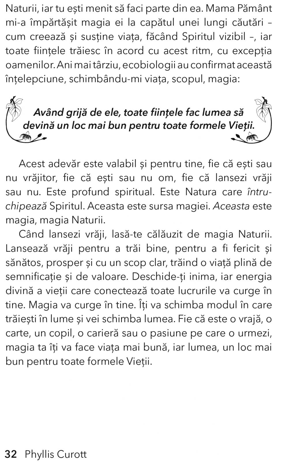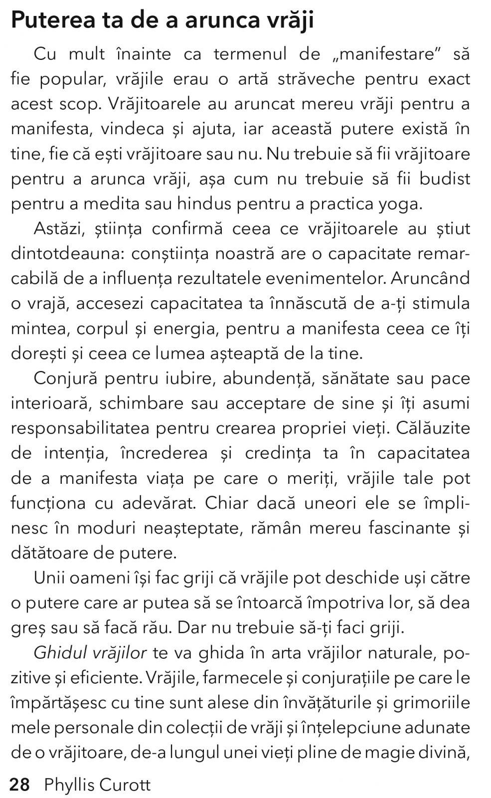 Alese cu grija din Grimoarele personale ale renumitei Preotese Wiccan Phyllis Curott si dintr-o viata plina de iubire divina, menite sa-ti umple viata de magie, vrajile din acest ghid te vor ajuta sa atragi iubirea si abundenta, sa-ti cultivi grija de sine si linistea interioara, sa te eliberezi de povara trecutului, sa invoci forta si puterea scopului tau si sa-ti deschizi spiritul catre Puterea Magica a Mamei Pamant si splendoarea vietii.Rosteste aceste vraji si vei aduce la viata cea mai importanta magie dintre toate, deoarece ele te vor transforma si iti vor da puterea de a schimba lumea.