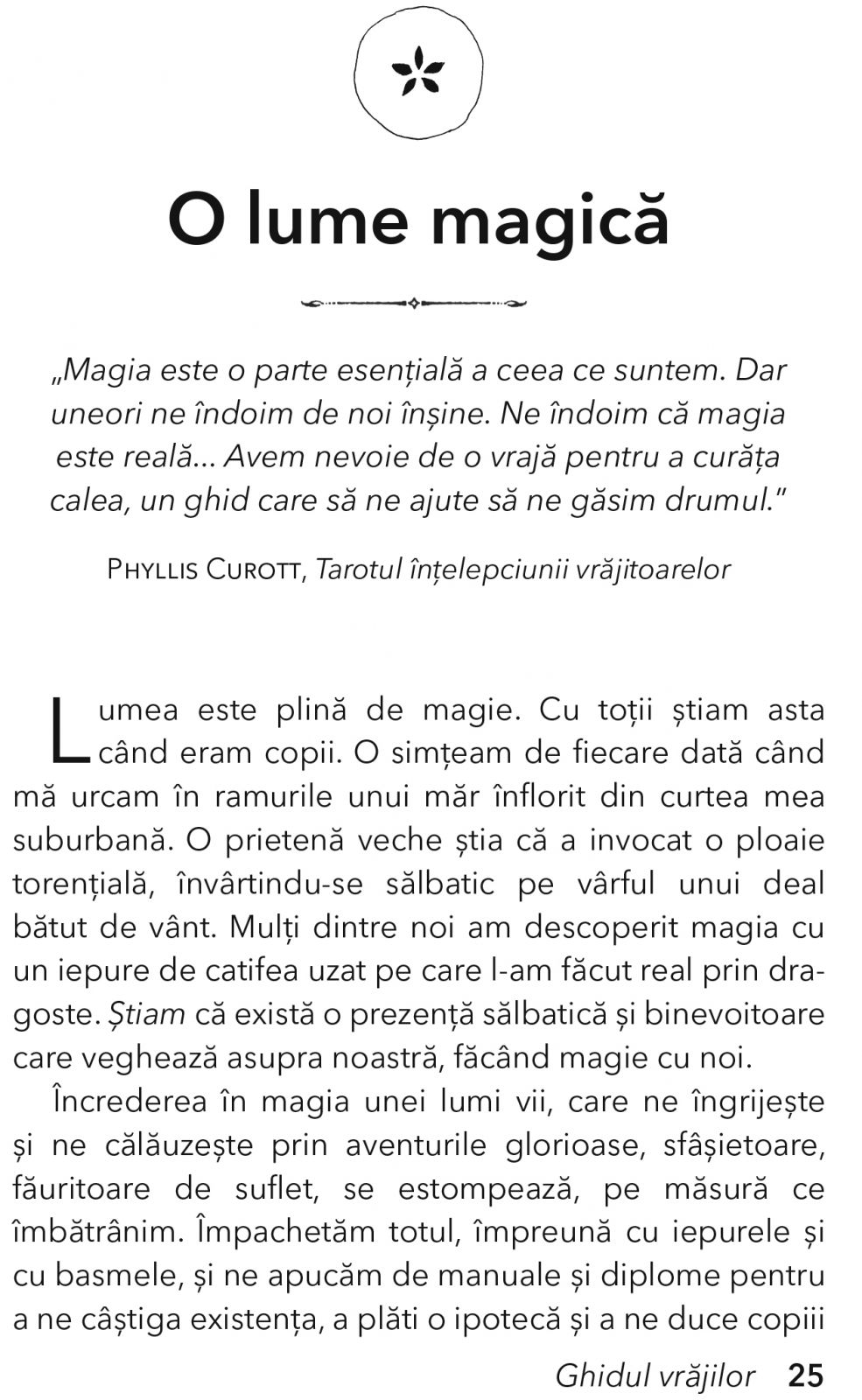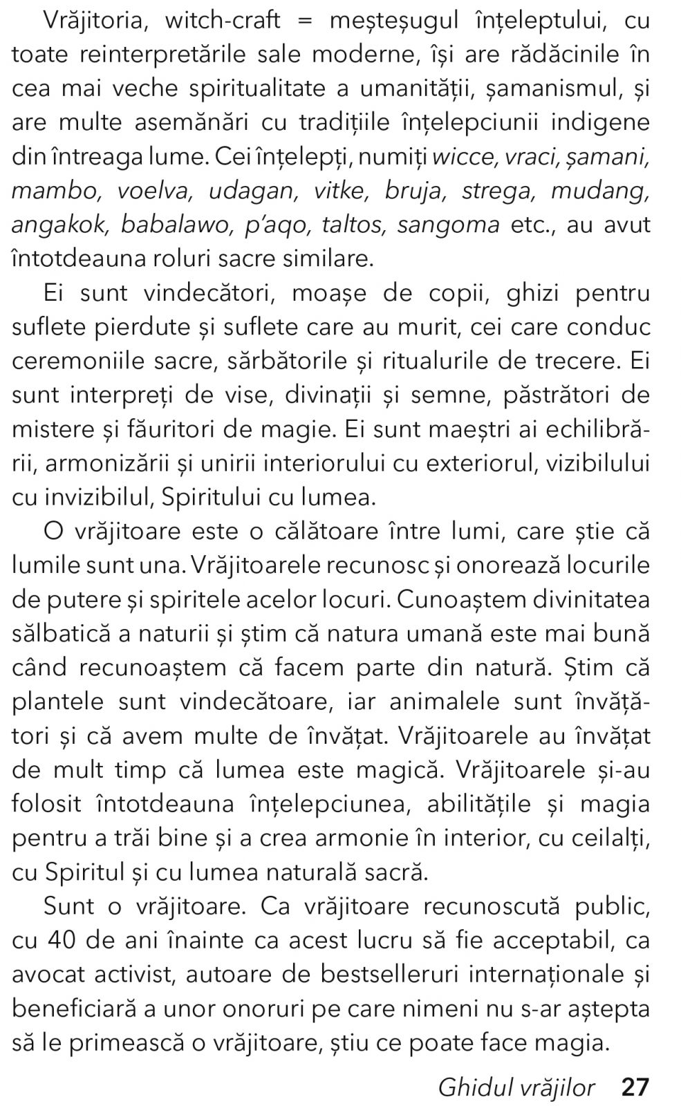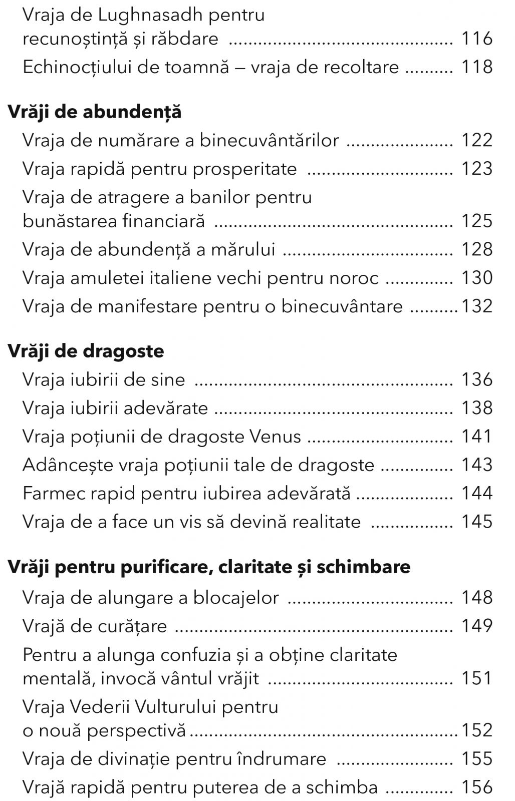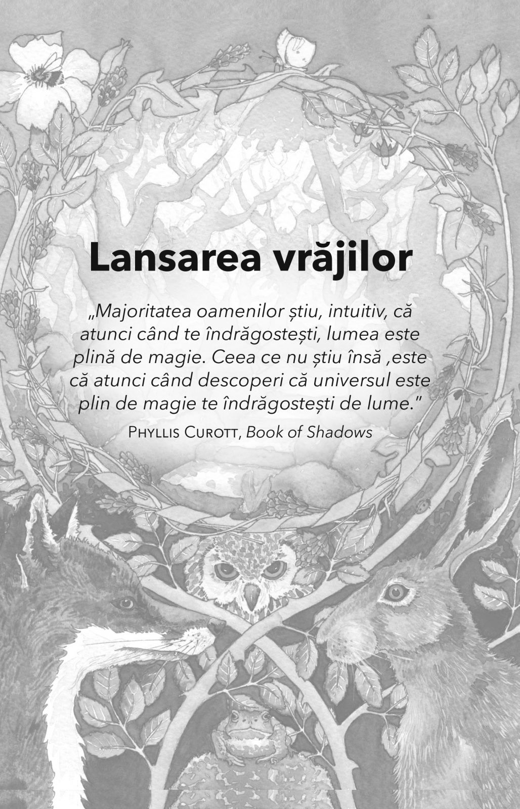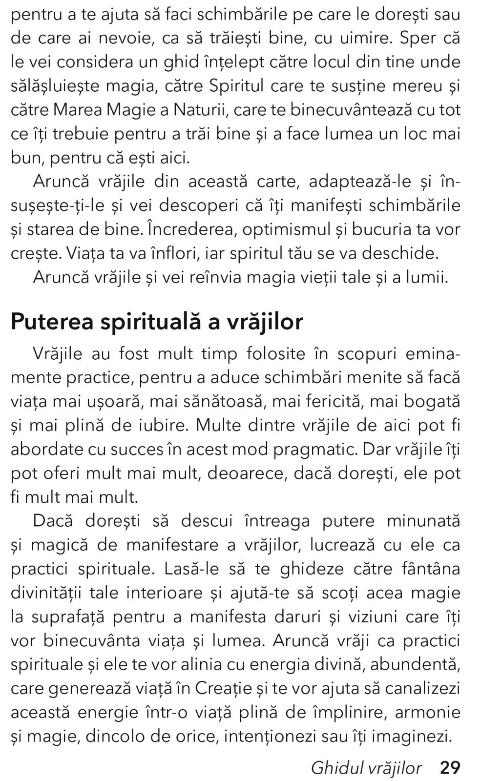 Alese cu grija din Grimoarele personale ale renumitei Preotese Wiccan Phyllis Curott si dintr-o viata plina de iubire divina, menite sa-ti umple viata de magie, vrajile din acest ghid te vor ajuta sa atragi iubirea si abundenta, sa-ti cultivi grija de sine si linistea interioara, sa te eliberezi de povara trecutului, sa invoci forta si puterea scopului tau si sa-ti deschizi spiritul catre Puterea Magica a Mamei Pamant si splendoarea vietii.Rosteste aceste vraji si vei aduce la viata cea mai importanta magie dintre toate, deoarece ele te vor transforma si iti vor da puterea de a schimba lumea.