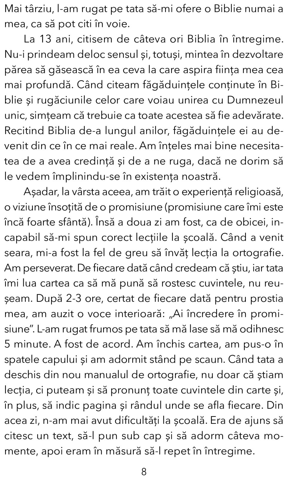 La 13 ani, citisem de cateva ori Biblia in intregime. Nu-i prindeam deloc sensul si, totusi, mintea in dezvoltare parea sa gaseasca in ea ceva la care aspira fiinta mea cea mai profunda. Cand citeam fagaduintele continute in Biblie si rugaciunile celor care voiau unirea cu Dumnezeul unic, simteam ca trebuie ca toate acestea sa fie adevarate. Recitind Biblia de-a lungul anilor, fagaduintele ei au devenit din ce in ce mai reale...