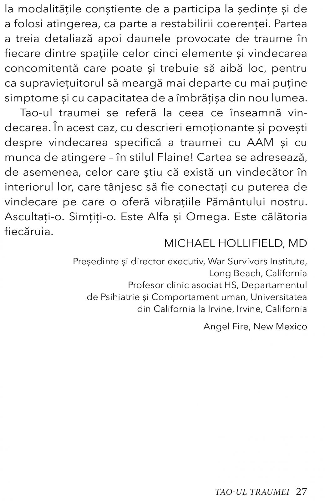 „Recomand cu caldura TAO-UL TRAUMEI terapeutilor din toate disciplinele. Este o sinteza unica a cercetarii academice orientale si occidentale si a experientei clinice in diagnosticarea si tratarea traumei si este deosebit de pertinenta odata cu constientizarea crescanda a stresului posttraumatic ca fiind cauza principala a multor probleme de sanatate publica. Este bogat ilustrata cu studii de caz si ofera instructiuni detaliate pentru a-i ajuta pe clienti sa finalizeze procesul de vindecare, nu doar sa-si suprime simptomele.”— Peter Eckman, MD, PhD, MAc(UK), autorul cartilor: Pe urmele imparatului galben, Emotiile dezvaluite si Acupuncturistul complet