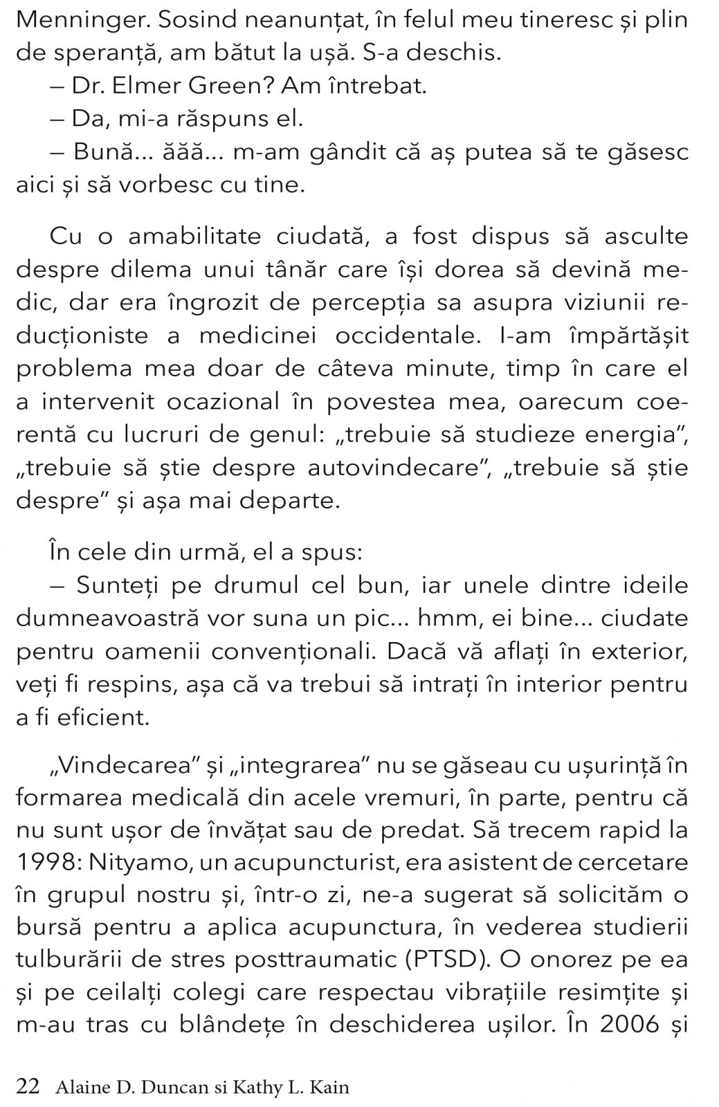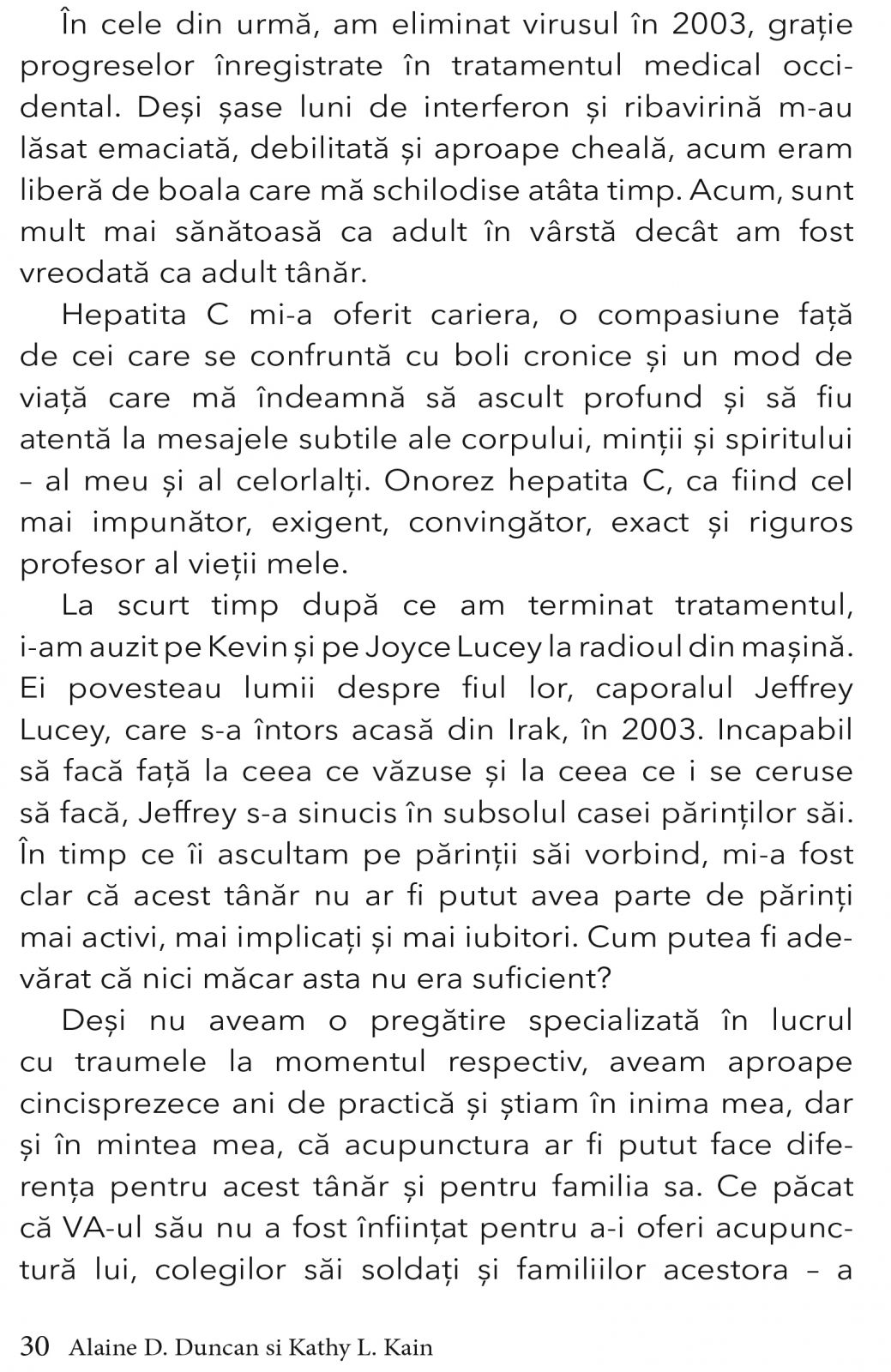 ALAINE DUNCAN, MAC, LAC, integreaza intelepciunea acupuncturii si a medicinei asiatice cu studiul neurobiologiei si al stresului traumatic in sala de clasa si in sala de tratament. Ea a fost director fondator al Crossings Healing and Wellness si este membru fondator al programului Integrative Health and Wellness de la Administratia Veteranilor din Washington DC, membru adjunct al facultatii la Universitatea de Sanatate Integrativa din Maryland si fondator al Capitoliului National al Acupuncturistilor fara Frontiere. Cercetarile sale includ studii de evaluare a medicinei integrative pentru oboseala de compasiune in cazul ingrijitorilor militari si utilizarea acupuncturii pentru tratarea bolii veteranilor din Razboiul din Golf, precum si a stresului traumatic legat de lupta, a durerii cronice si a durerilor de cap cronice. Duncan locuieste in Hyattsville, Maryland.