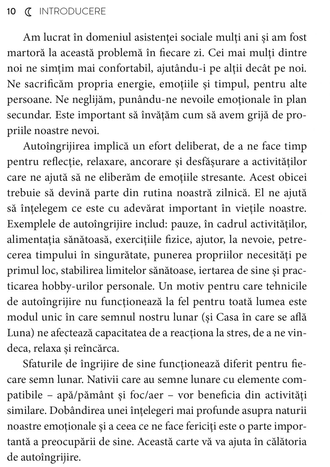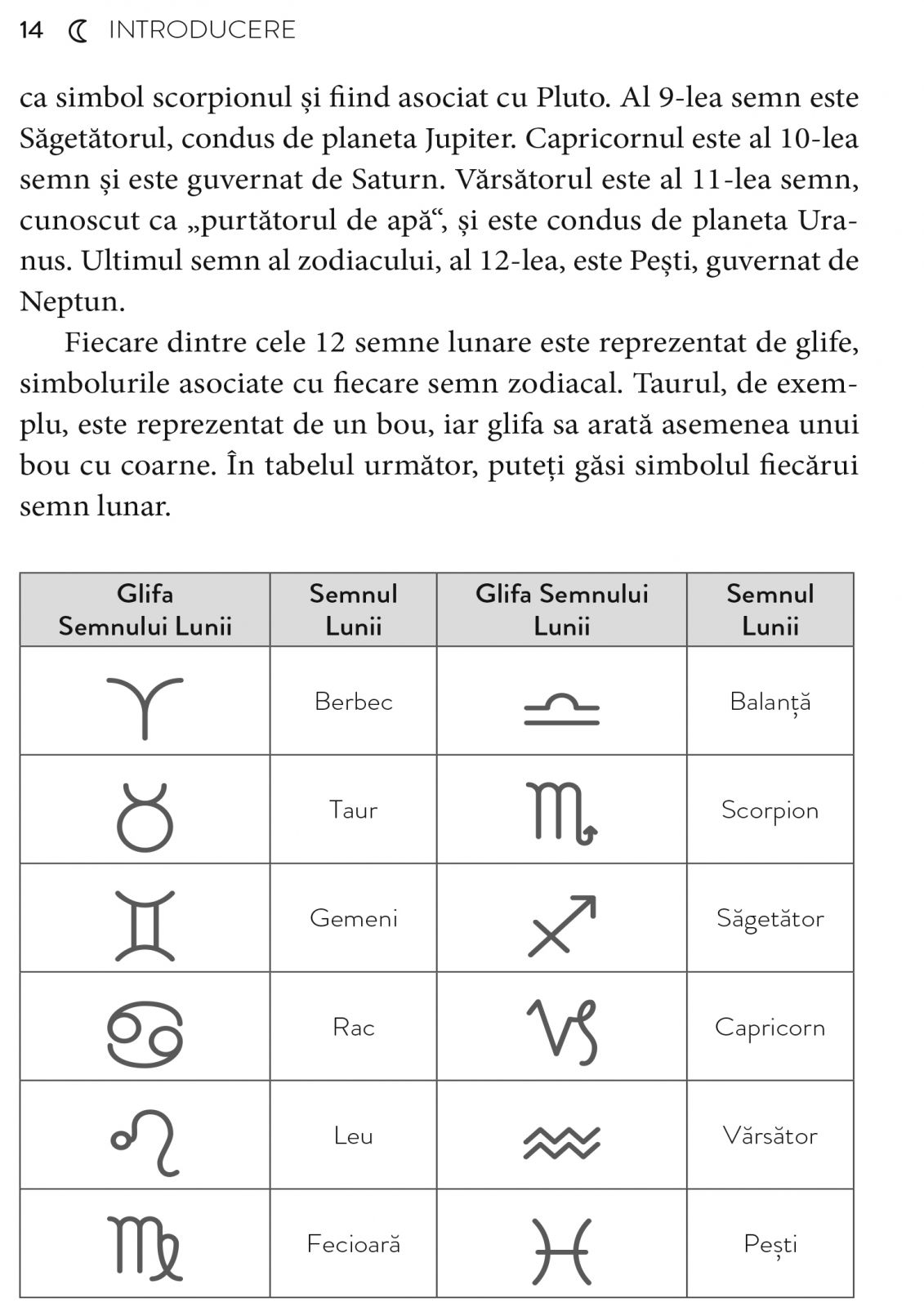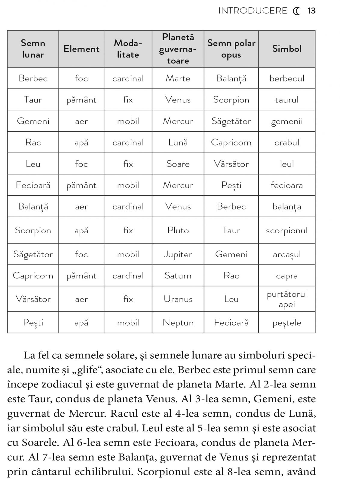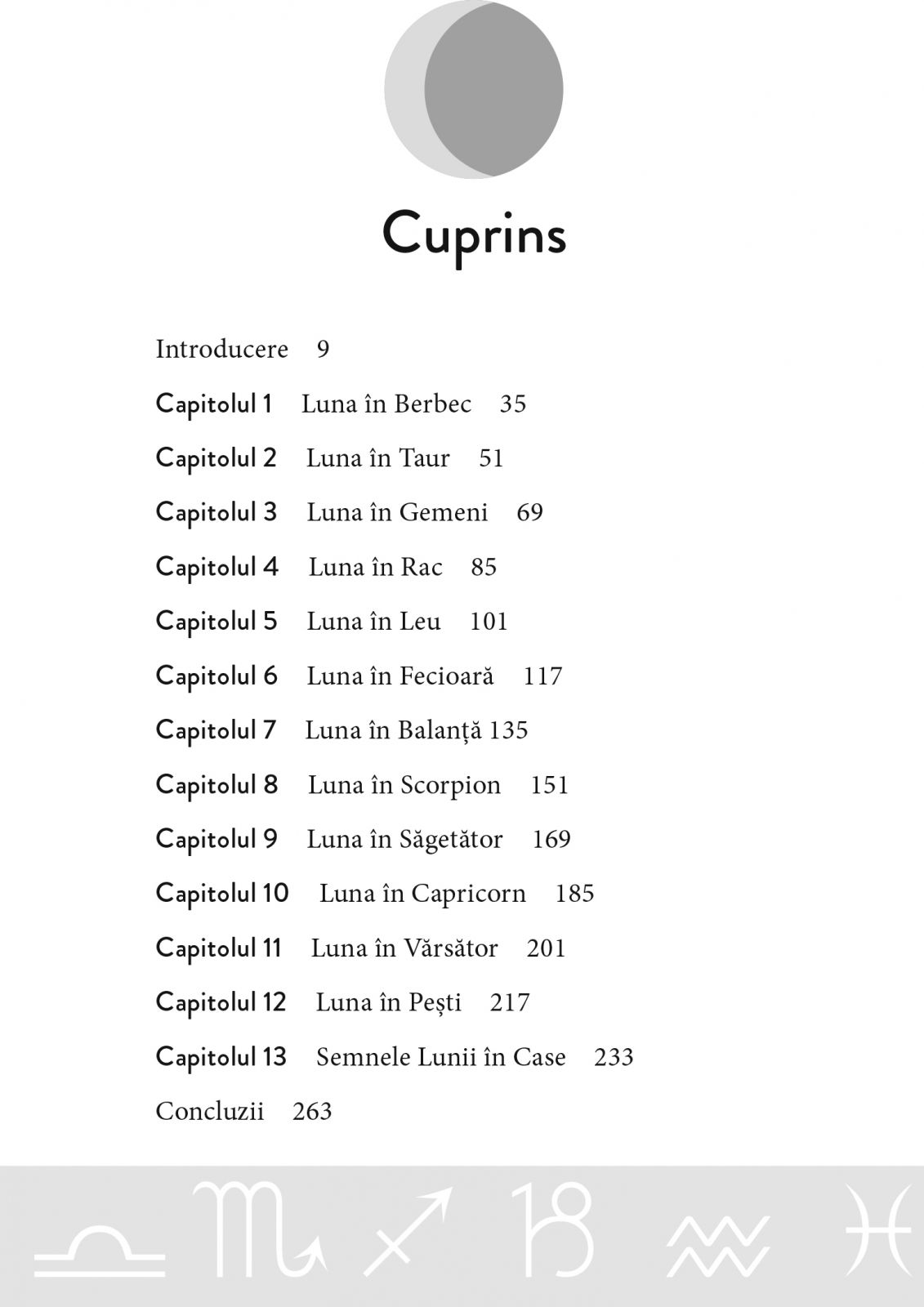 Fiecare capitol ofera o analiza amanuntita a unui anumit semn lunar, de la Berbec la Pesti, ajutandu-va sa invatati mai multe despre propriul sine ori despre cineva drag. Pe langa trasaturi, valori, afirmatii si indrumari de ingrijire personala pentru fiecare semn, veti descoperi si modurile in care abordeaza relatiile, gasesc confort si se confrunta cu provocarile. Aceasta carte este cheia pentru a debloca darurile semnului vostru lunar.