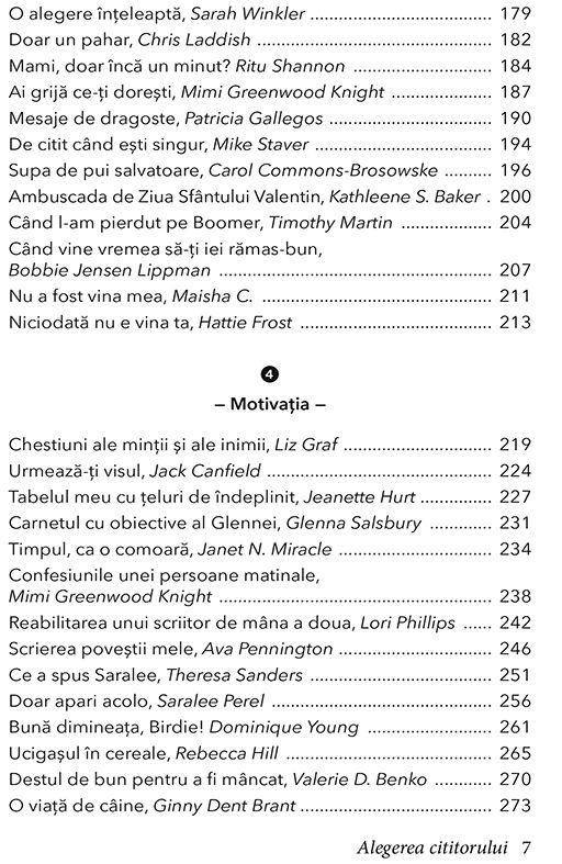 Veti citi despre sotia de militar, care a fost pregatita mintal pentru ,,acel telefon" chiar in dimineata in care citise o poveste despre un soldat care isi pierduse membrele. Veti citi despre veteranul din Vietnam, care a descoperit ca unul dintre soldatii pe care ii salvase a ajuns de patru ori campion Super Bowl, lucru pe care l-a aflat zeci de ani mai tarziu, intr-o povestire Supa de pui pentru suflet. Veti citi despre o mama biologica, al carei copil, in varsta de 23 de ani, a gasit-o prin intermediul uneia dintre povestirile noastre. In total, veti citi 100 de povesti despre revelatii, schimbari de atitudine, sfaturi grozave, ponturi motivationale, ce inseamna sa faci bine si legaturile uimitoare pe care oamenii le stabilesc, in urma acestor povestiri.