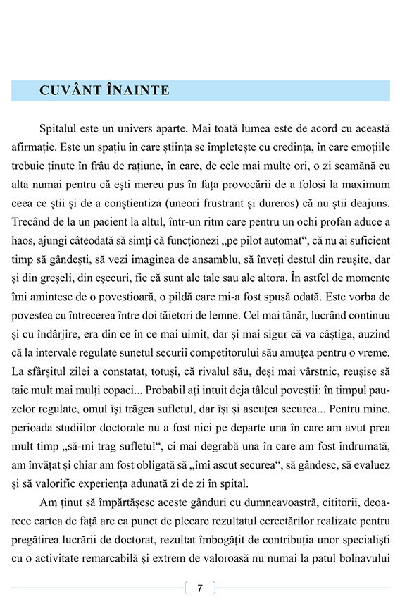 ,,Trecand de la un pacient la altul, intr-un ritm care pentru un ochi profan aduce a haos, ajungi cateodata sa simti ca functionezi ,,pe pilot automat", ca nu ai suficient timp sa gandesti, sa vezi imaginea de ansamblu, sa inveti destul din reusite, dar si din greseli, din esecuri, fie ca sunt ale tale sau ale altora. In astfel de momente imi amintesc de o povestioara, o pilda care mi-a fost spusa odata. Este vorba de povestea cu intrecerea intre doi taietori de lemne. Cel mai tanar, lucrand continuu si cu indarjire, era din ce in ce mai uimit, dar si mai sigur ca va castiga, auzind ca la intervale regulate sunetul securii competitorului sau amutea pentru o vreme. La sfarsitul zilei a constatat, totusi, ca rivalul sau, desi mai varstnic, reusise sa taie mult mai multi copaci... Probabil ati intuit deja talcul povestii: in timpul pau- zelor regulate, omul isi tragea sufletul, dar isi si ascutea securea... Pentru mine, perioada studiilor doctorale nu a fost nici pe departe una in care am avut prea mult timp sa-mi trag sufletul", ci mai degraba una in care am fost indrumata, am invatat si chiar am fost obligata sa imi ascut securea", sa gandesc, sa evaluez si sa valorific experienta adunata zi de zi in spital."