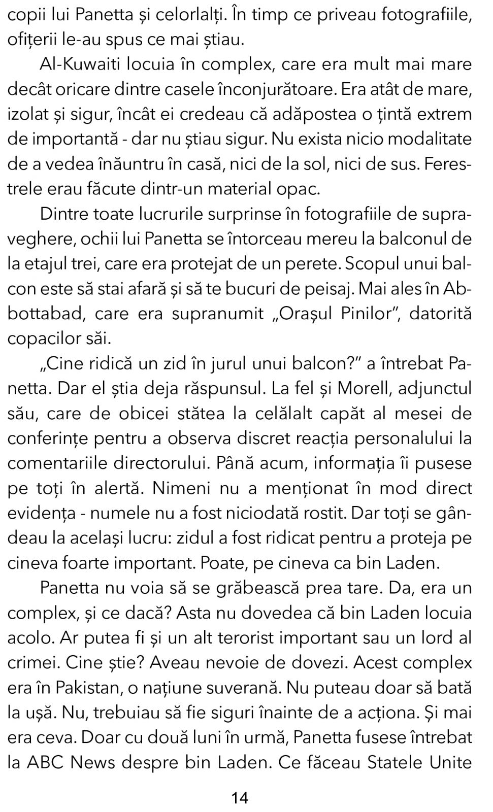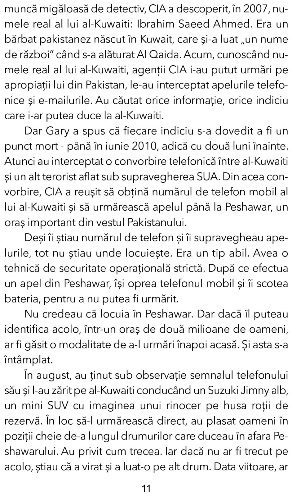 Cartea ofera informatii noi culese din interviurile aprofundate ale lui Wallace cu figuri centrale, printre care amiralul William H. McRaven - liderul operatiunii din Pakistan, precum si directorul CIA, Panetta, secretarul de stat, Hillary Rodham Clinton, secretarul Apararii, Robert Gates; consilierul pentru securitate nationala, Tom Donilon, si doi membri ai echipei SEAL Six care participa la raid, inclusiv operatorul special care il ucide pe Osama bin Laden. Wallace aduce, de asemenea, la viata elementele umane ale acestei povesti, vorbind cu familiile care au pierdut persoane dragi la 11 septembrie, impartasind prin ce au trecut rudele din echipa SEAL Six si aducandu-ne in interiorul tensionatei Situation Room din timpul raidului. Bin Laden: numaratoarea inversa, este un thriller istoric plin de intriga, actiune cinematografica si reportaje proaspete despre cursa pentru prinderea si aducerea in fata justitiei a creierului celui mai important atac terorist din istoria Americii.