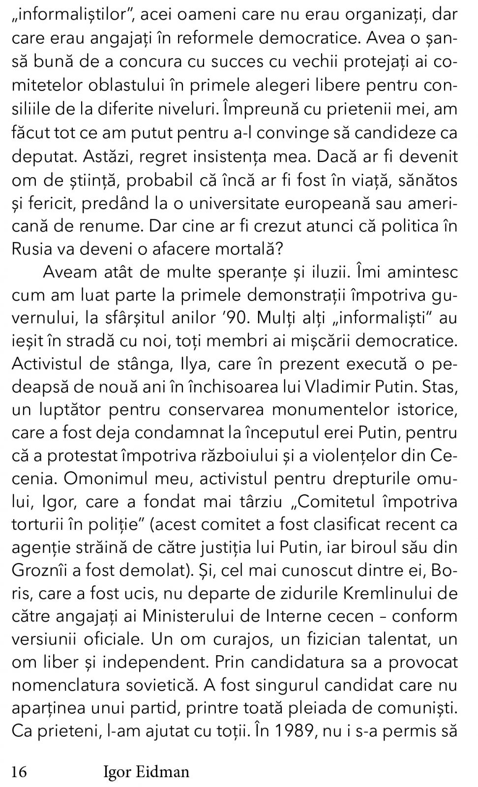 "Igor Eidman nu este doar un sociolog academic serios, ci si un publicist de exceptie, motiv pentru care cartea sa ofera o combinatie rara de analiza bine fundamentata a ceea ce se intampla in Rusia si o prezentare captivanta. El este unul dintre putinii autori rusi care, inca de la inceput, au deslusit fara cusur esenta regimului lui Putin. De asemenea, acest «diagnostic» corect i-a permis lui Eidman sa prognozeze exact «cursul bolii»: evolutia spre o adevarata dictatura fascista in Rusia."