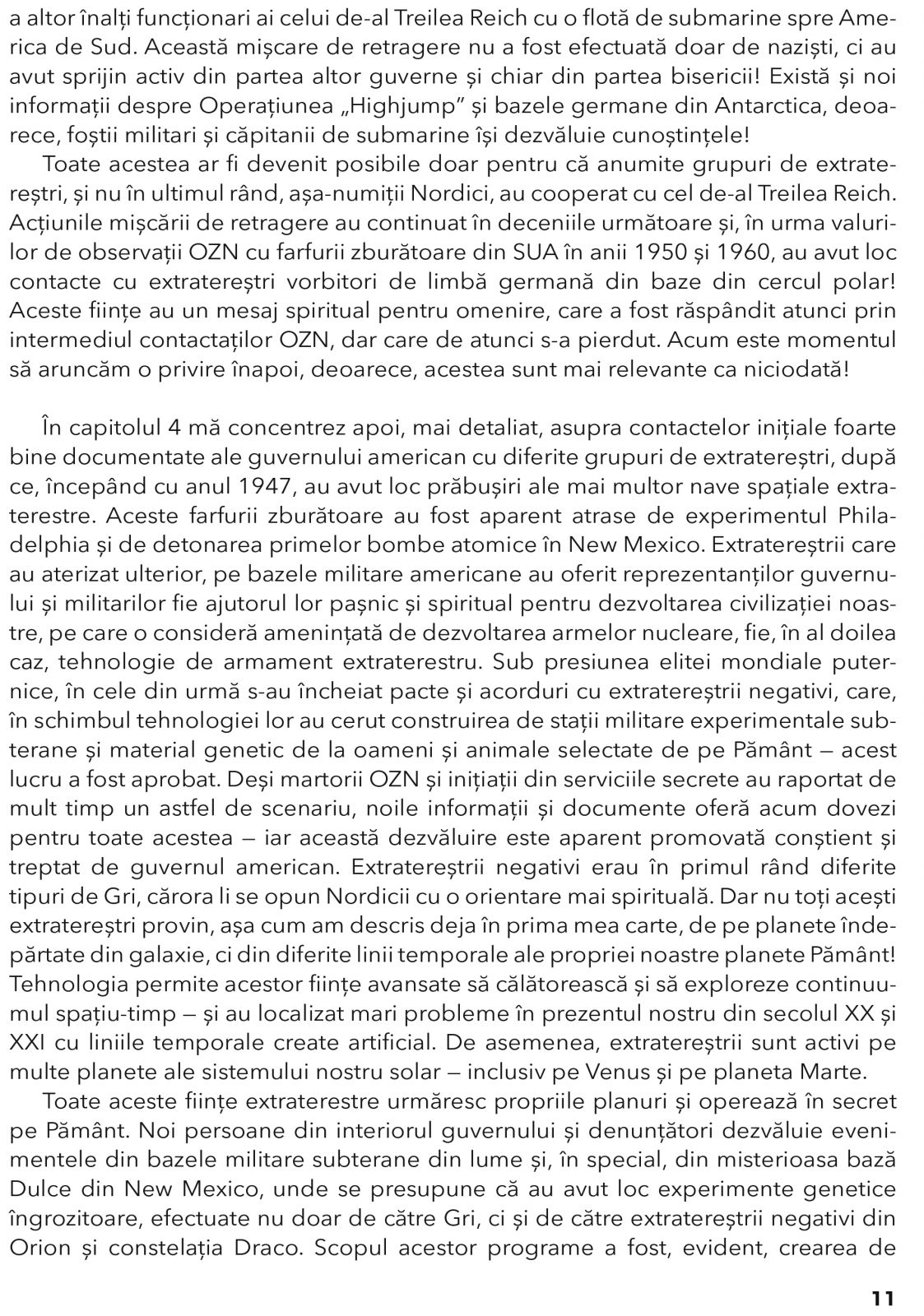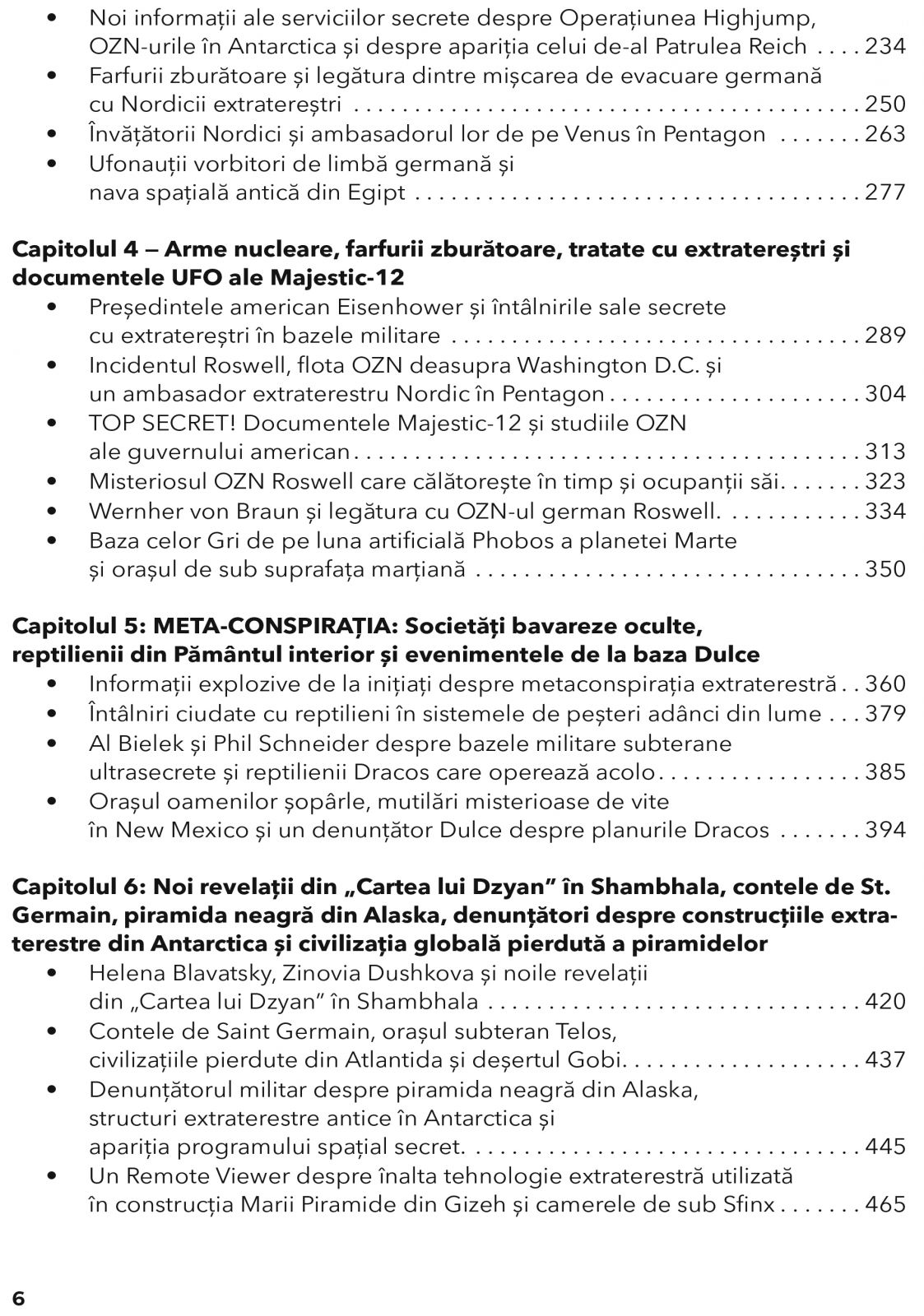 • Legatura dintre farfuriile zburatoare, armele nucleare si Roswell, documente declasificate despre Ma­jestic-12 si contractele strict secrete cu extraterestri Gri si reptilieni.