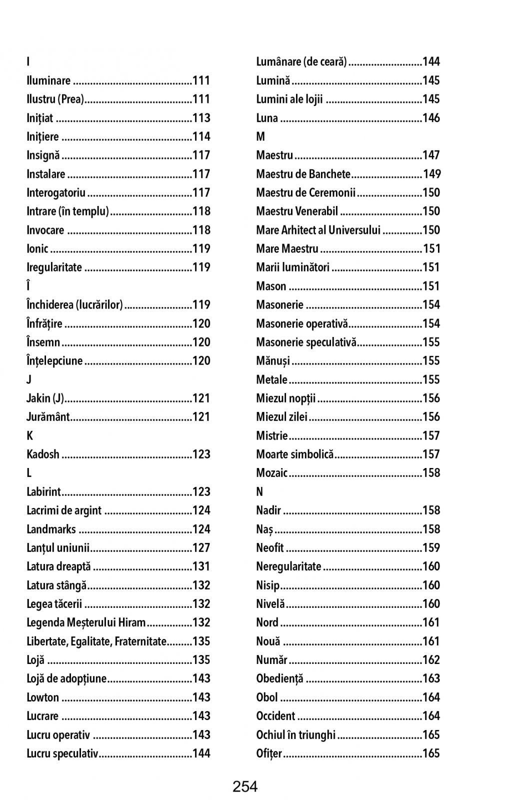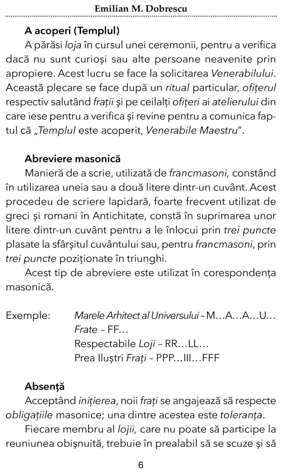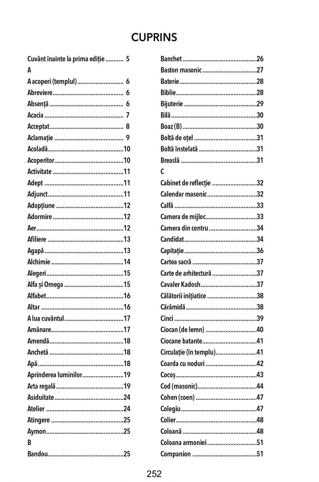 Lucrarea are ca scop explicarea unor termeni uzuali din Francmasonerie, fiind utila atat